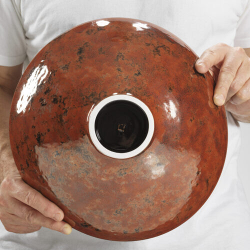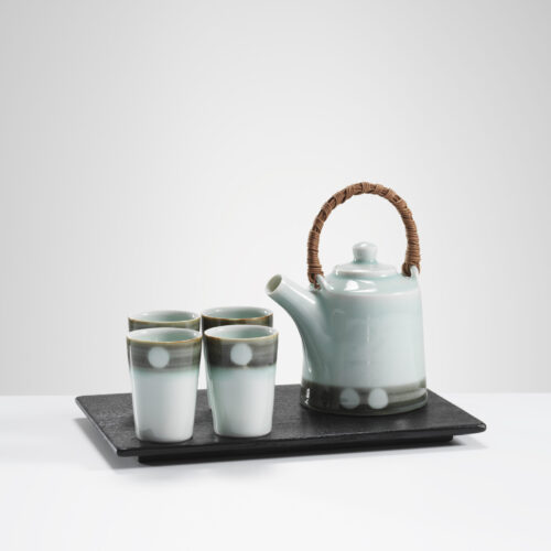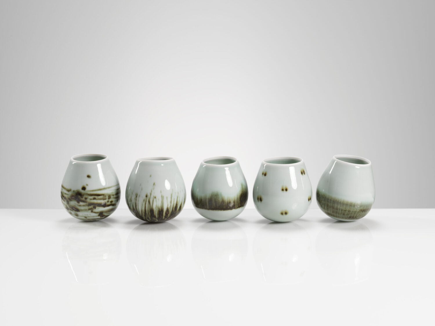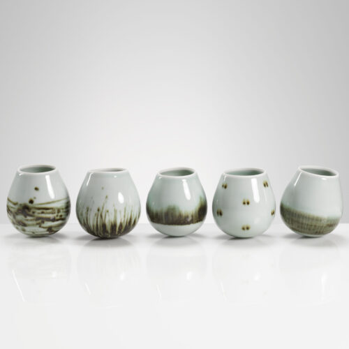 All of Chris’s work is thrown and turned on the wheel, using porcelain as the clay of choice. His glazes are predominantly tenmoku and celadon, often combined—a deliberately restricted palette that nevertheless continues to offer fresh possibilities. The pieces are reduction-fired in a gas kiln.